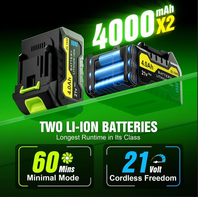 • 【Extended Runtime】: This cordless leaf blower comes with two removable, rechargeable 21V/4.0Ah batteries and a rapid charger. The fast-charging system fully charges each battery in just 1.5 hours, delivering up to 60 minutes of extended runtime. It’s a precision-engineered power and performance cycle, designed for tasks that won’t wait.