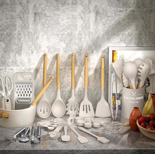 34PCS KITCHEN UTENSILS SET WITH HOLDER From the everyday kitchen spoons to the garlic crusher, This 34PCS kitchen utensils tools set included all the kitchen stuff you could possibly need to bring out your inner chef. This means you don’t have to spend extra money on repetitive utensil tools. This cooking utensils set includes a Slotted Spatula, Slotted Spoon, Turner, Pasta Server, Kitchen Tongs, Grater, Scissors, and so on. It is a great starter pack for a first apartment
